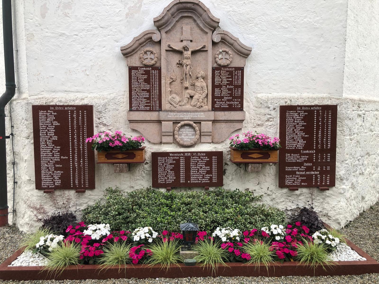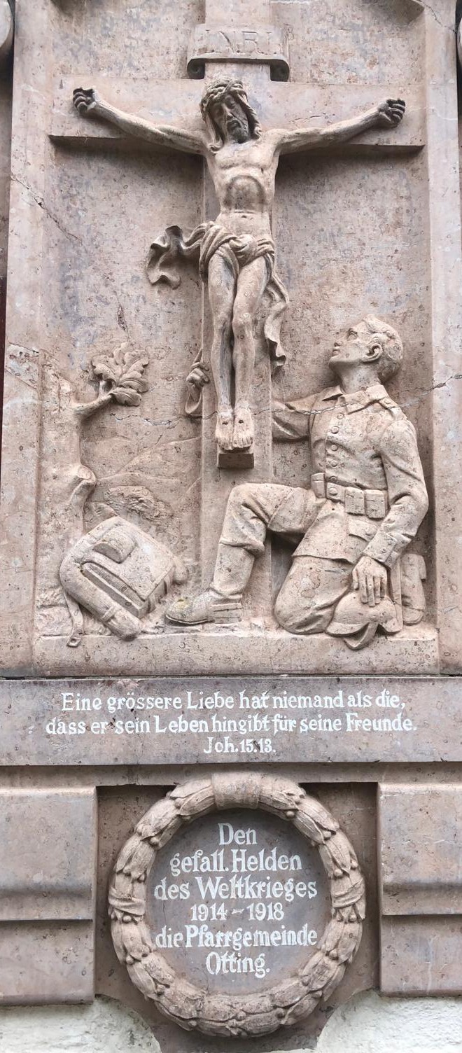 Ein stark zurückgeschnittener Eichenbaum der dennoch einige Triebe hat, symbolisiert die Heimat, welche durch den für Deutschland und Bayern unglücklichen Kriegsausgang gestutzt wurde (Reparationszahlungen und von den Siegerstaaten verhängte Auflagen), aber dennoch die Kraft hat wieder zu Kräften zu kommen. Der Spruch und die Inschrift im Kranz unten sprechen für sich. Auf zwei Tafeln sind die Gefallenen, Vermissten und an den Kriegsfolgen in der Heimat Verstorbenen aus der Pfarrei Otting aufgelistet. Der geneigte Leser kann sich mittels Klick auf den Namen auf der rechten Seite über die genannte Person informieren. |