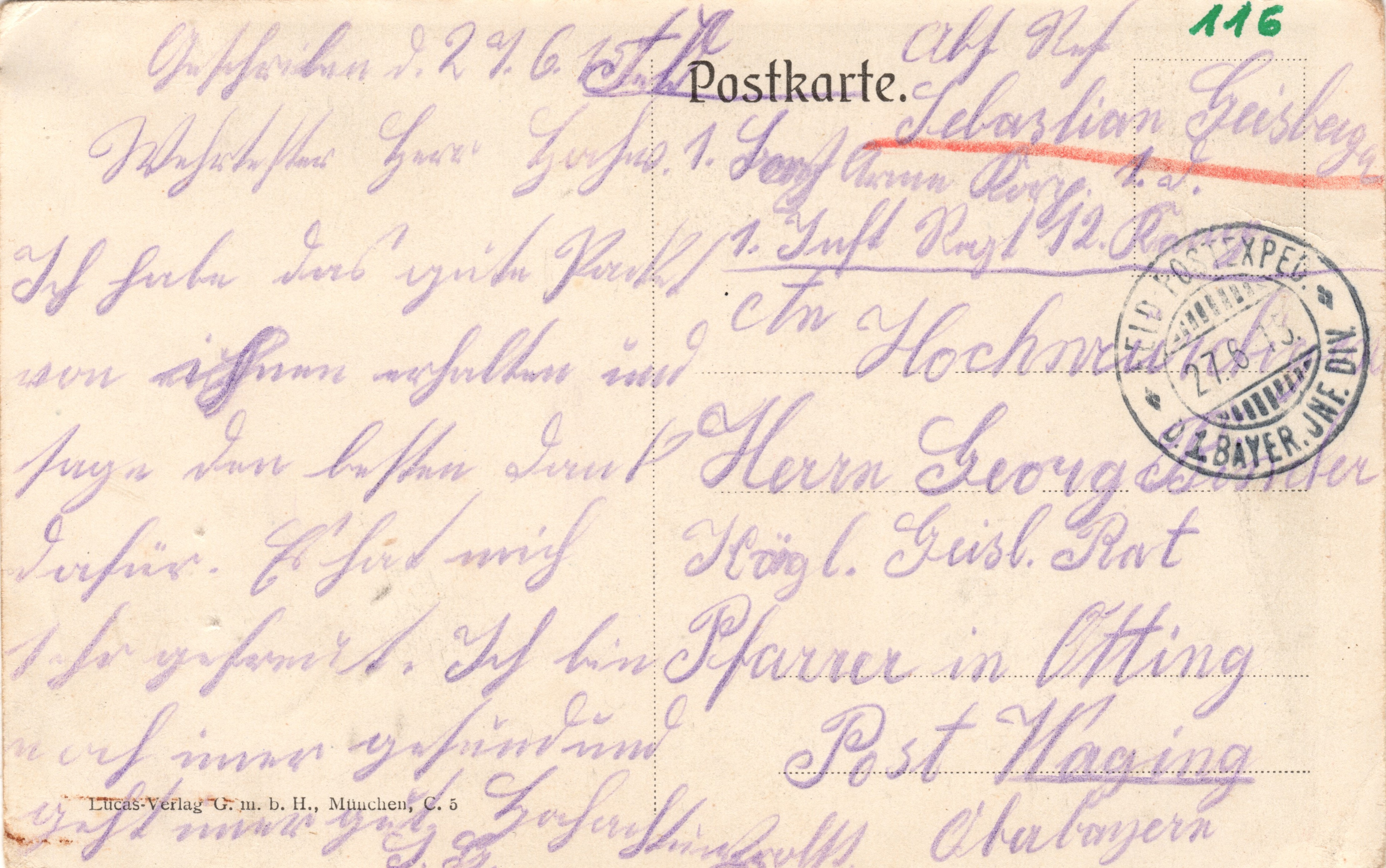 Geschrieben d. 29.6.15 Wehrtester Herr Hochw. Ich habe das gute Paket von Ihnen erhalten und sage den besten Dank dafür. Es hat mich sehr gefreut. Ich bin noch immer gesund und geht immer gut. Hochachtungsvoll S. G.
