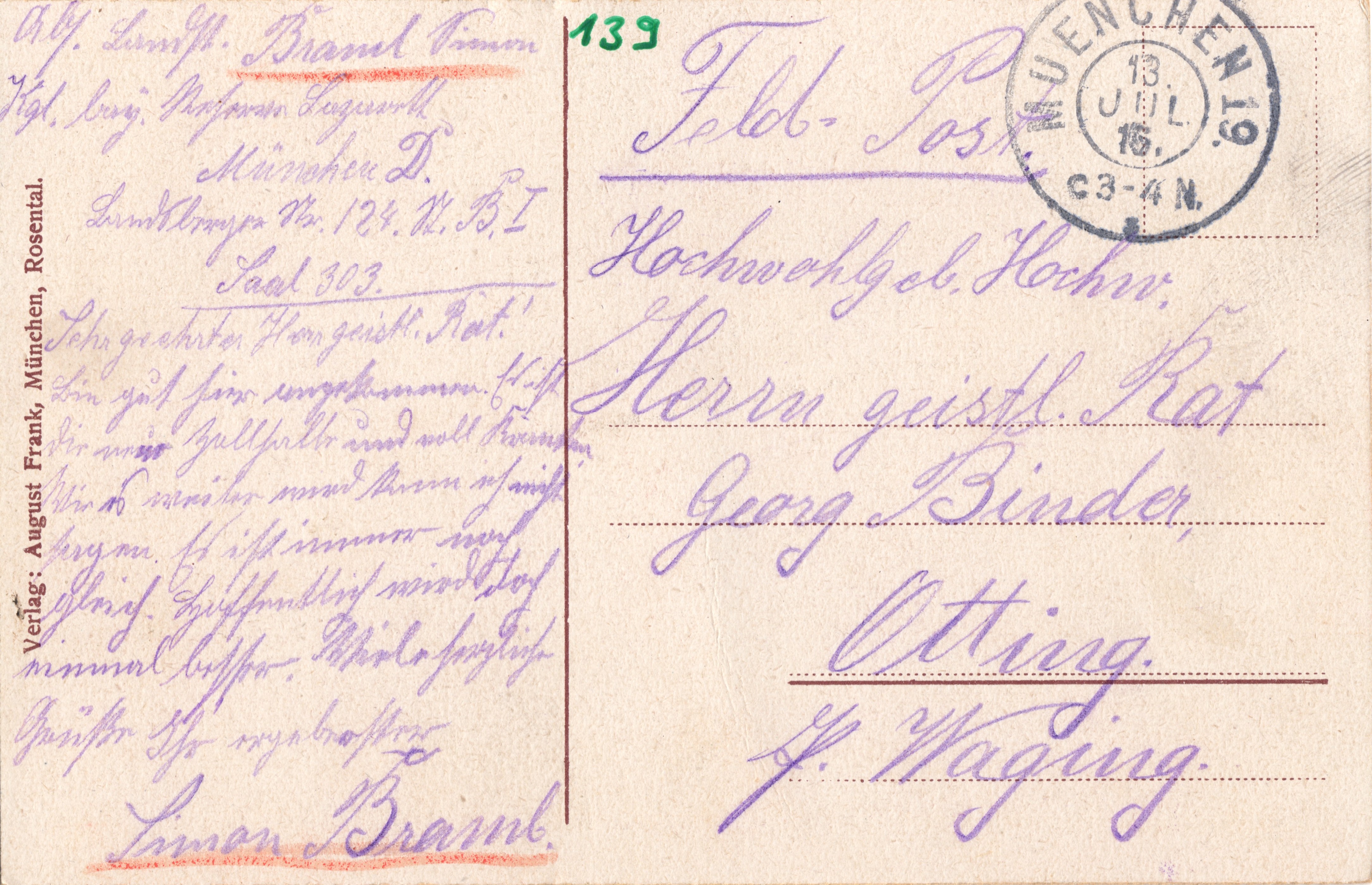 Sehr geehrter Herr Geistl Rat! Bin gut hier angekommen. Es ist die neue Zollhalle und voll Kranken. Wie es weiter wird kann ich nicht sagen. Es ist immer noch gleich. Hoffentlich wirds doch einmal besser. Viele herzliche Grüße Ihr ergebenster Simon Braml