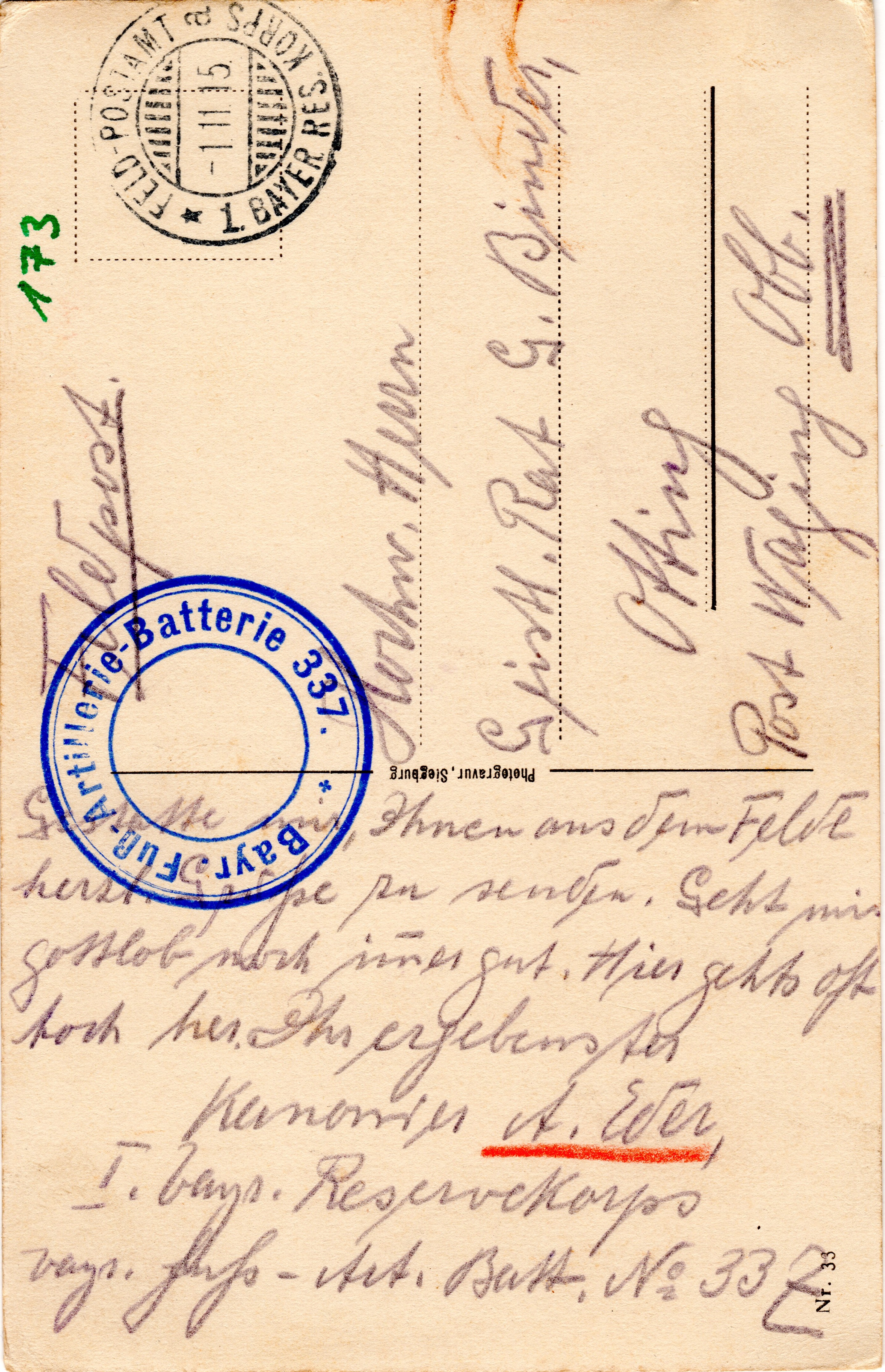 Gestatte mir Ihnen aus dem Felde herzl. Grüße zu senden. Geht mir gottlob noch immer gut. Hier geht's oft hoch her. Ihr ergebenster Kanonier A. Eder 1. bayr. Reservekorps bayr. Fuß-Art. Batt. No 337