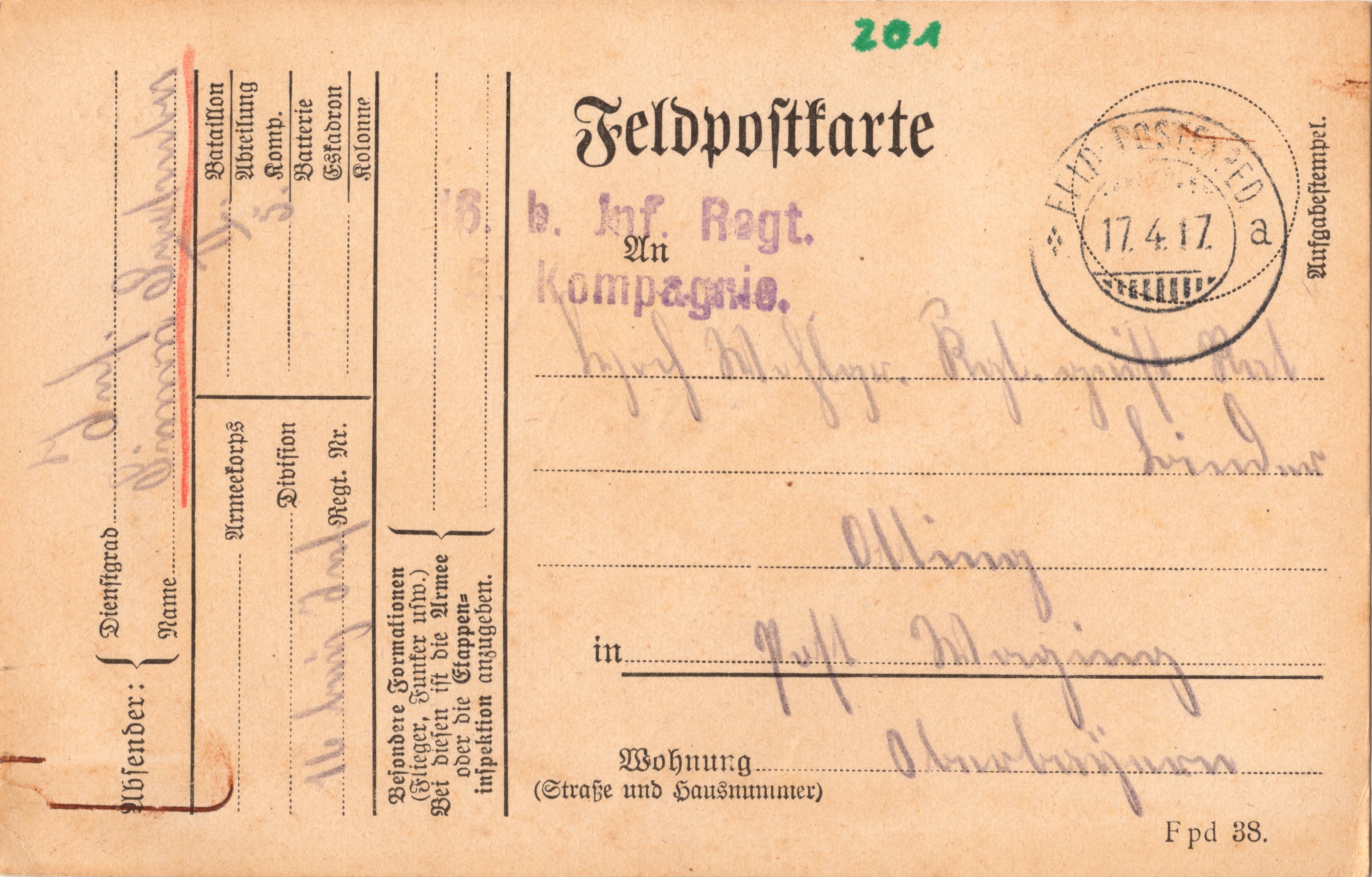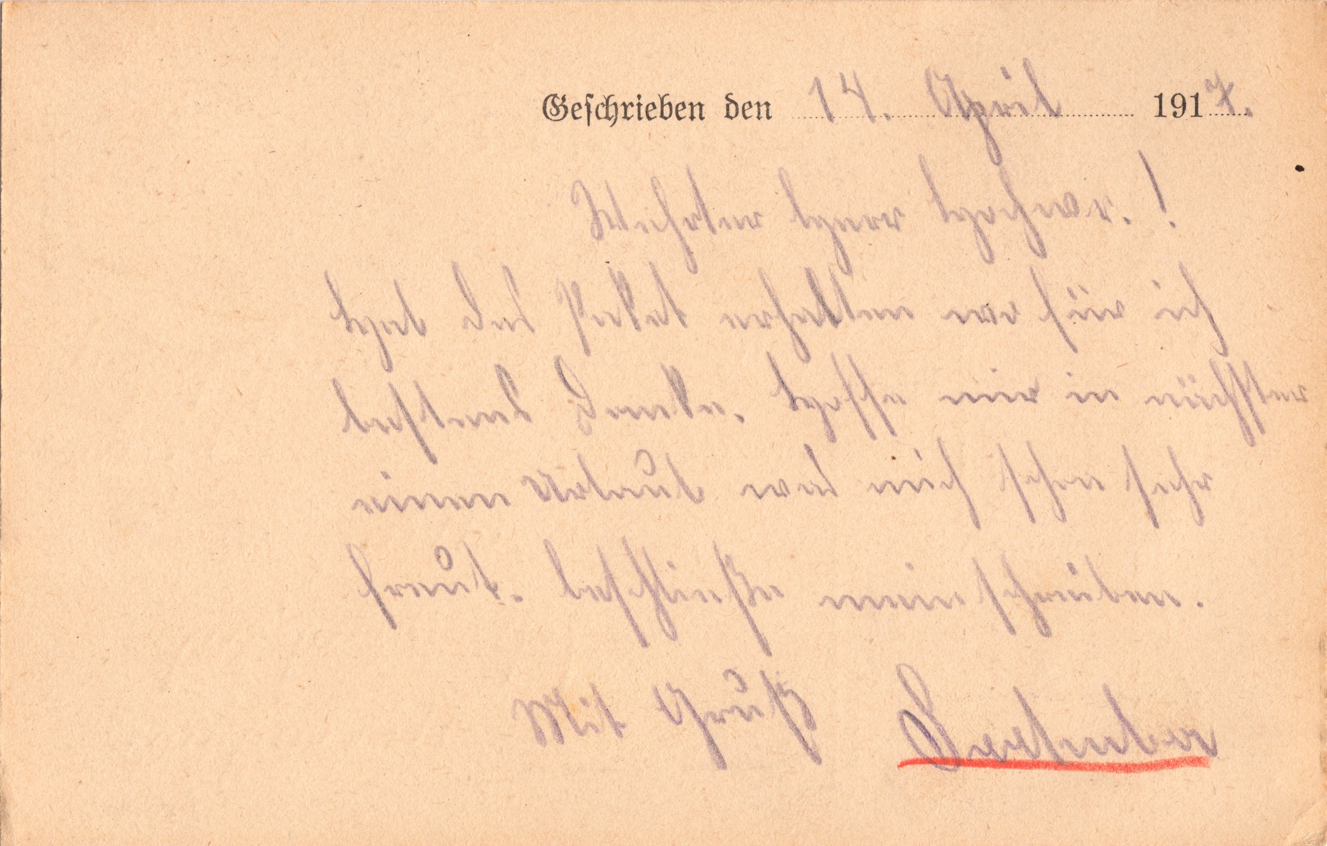 Geschrieben den 14. April 1917 Wehrter Herr Hochw! Hab das Paket erhalten wofür ich bestens danke. Hoffe mir in nächster einen Urlaub was mich schon sehr freut. Beschließe mein Schreiben. Mit Gruß Seehuber Abs. Inf. Simon Seehuber 16. Bayr. Inf. Rgmt., 2. Baon, 5. Komp