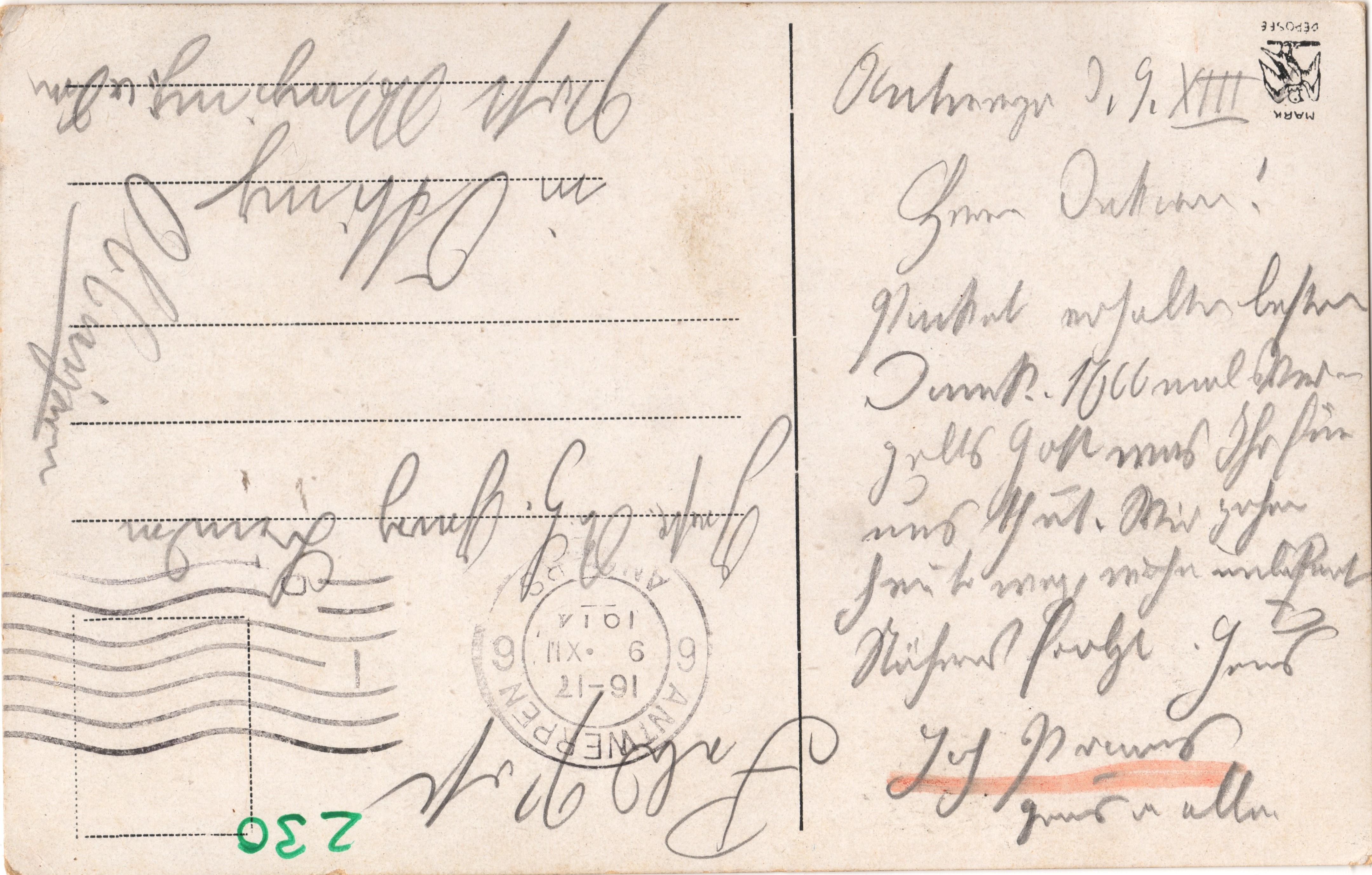 Antwerpen d. 9.8. (Poststempel 1914) Herr Dekan! Paket erhalten besten Dank 1000 mal Ver- gelts Gott was Ihr für uns Tut. Wir gehen heute weg, wohin unbekannt. Näheres folgt Gruß Joh. Prams Gruß an alle