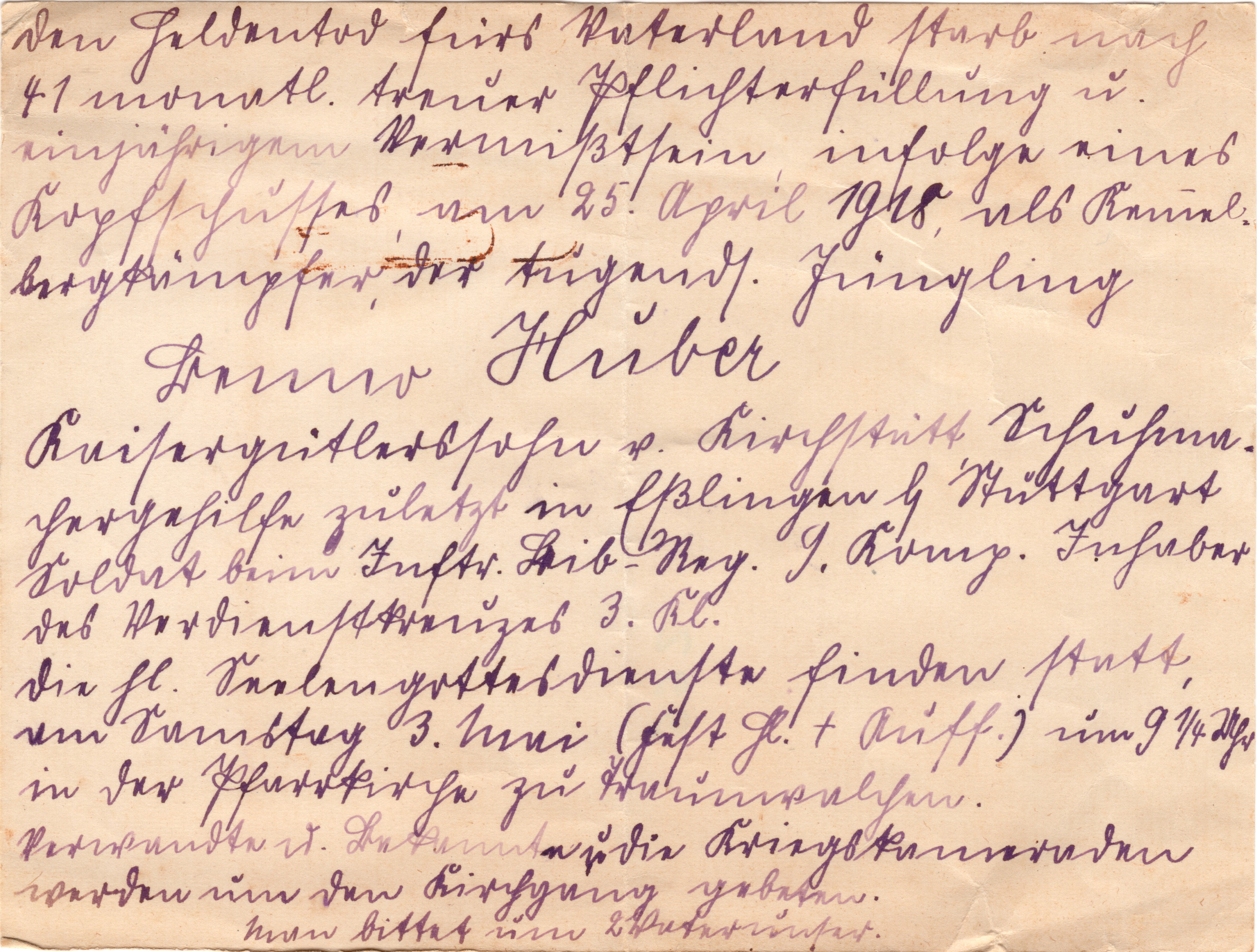 Der Autor ist nicht der Gefallene selbst, aufgrund des Schriftbildes auch nicht Pfarrer Binder, sondern mit hoher Wahrscheinlichkeit ein Angehöriger von Benno Huber oder der damalige Traunwalchner Pfarrer.