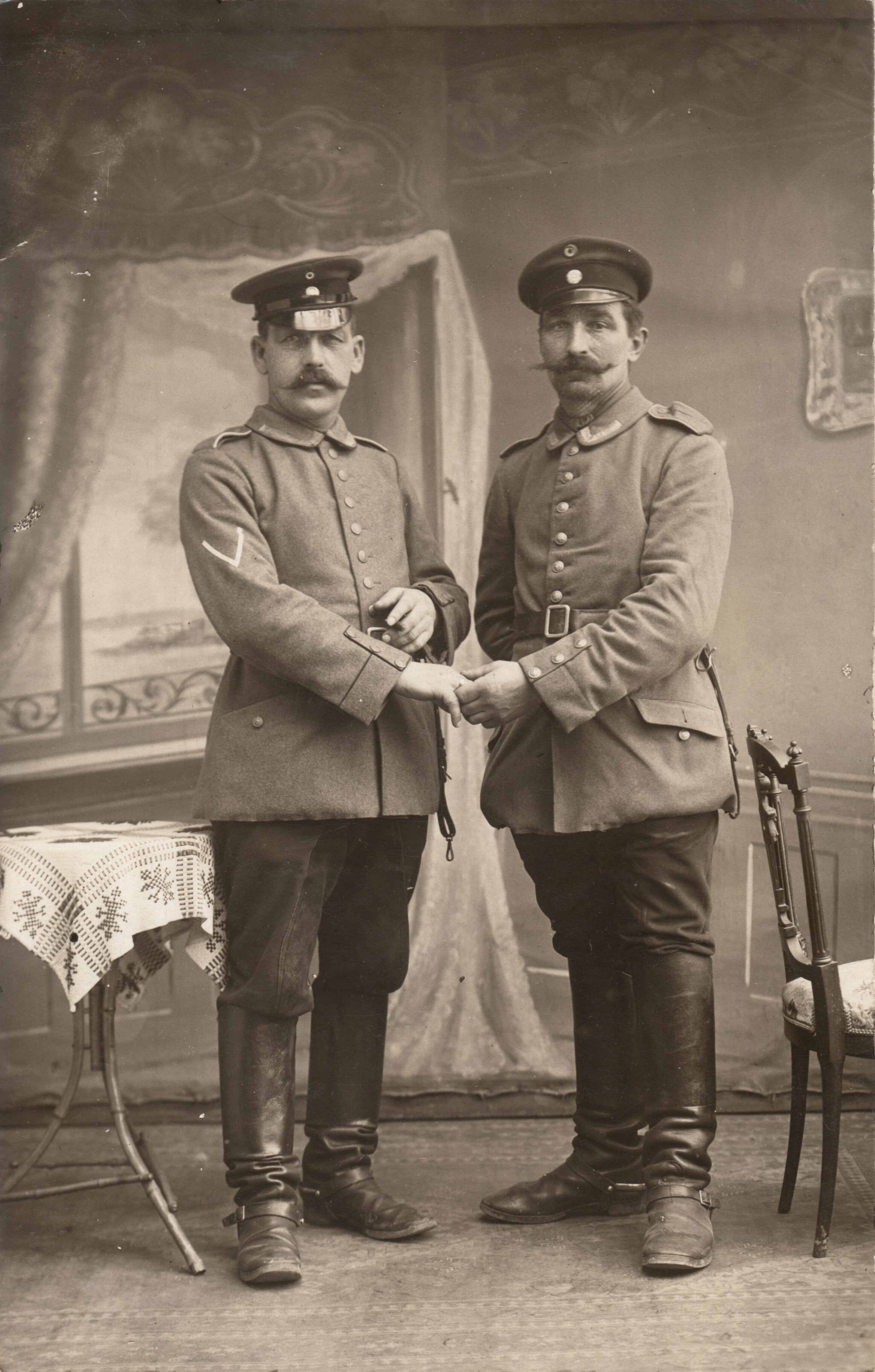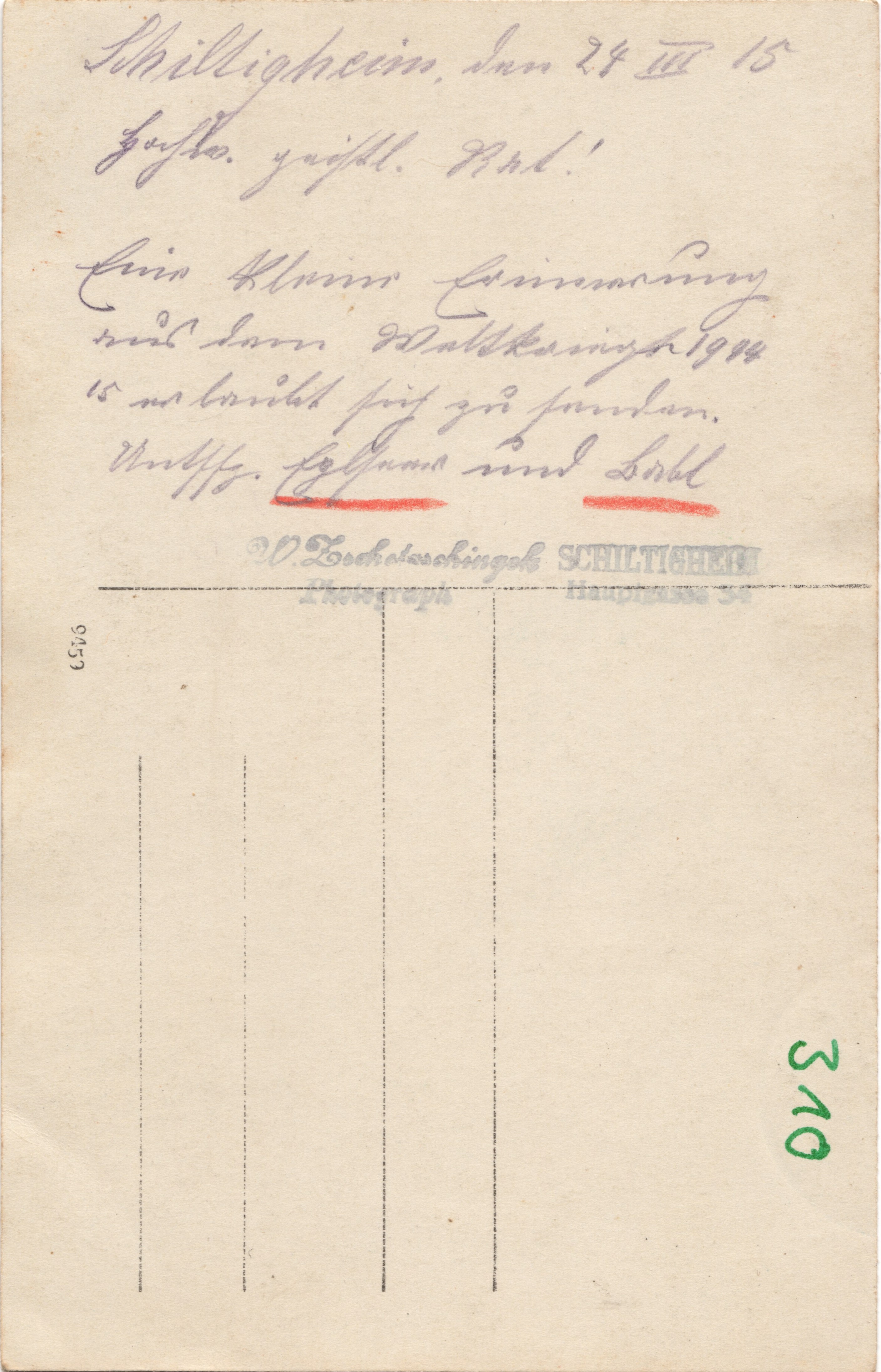 Schiltigheim, den 24.3.15 Hochw. geistl. Rat! Eine kleine Erinnerung aus dem Weltkrieg 1914 15 erlaubt sich zu senden Untffz. Eglseer und Babl Bild der Soldaten Georg Eglseer (links) und Karl Babl (rechts)