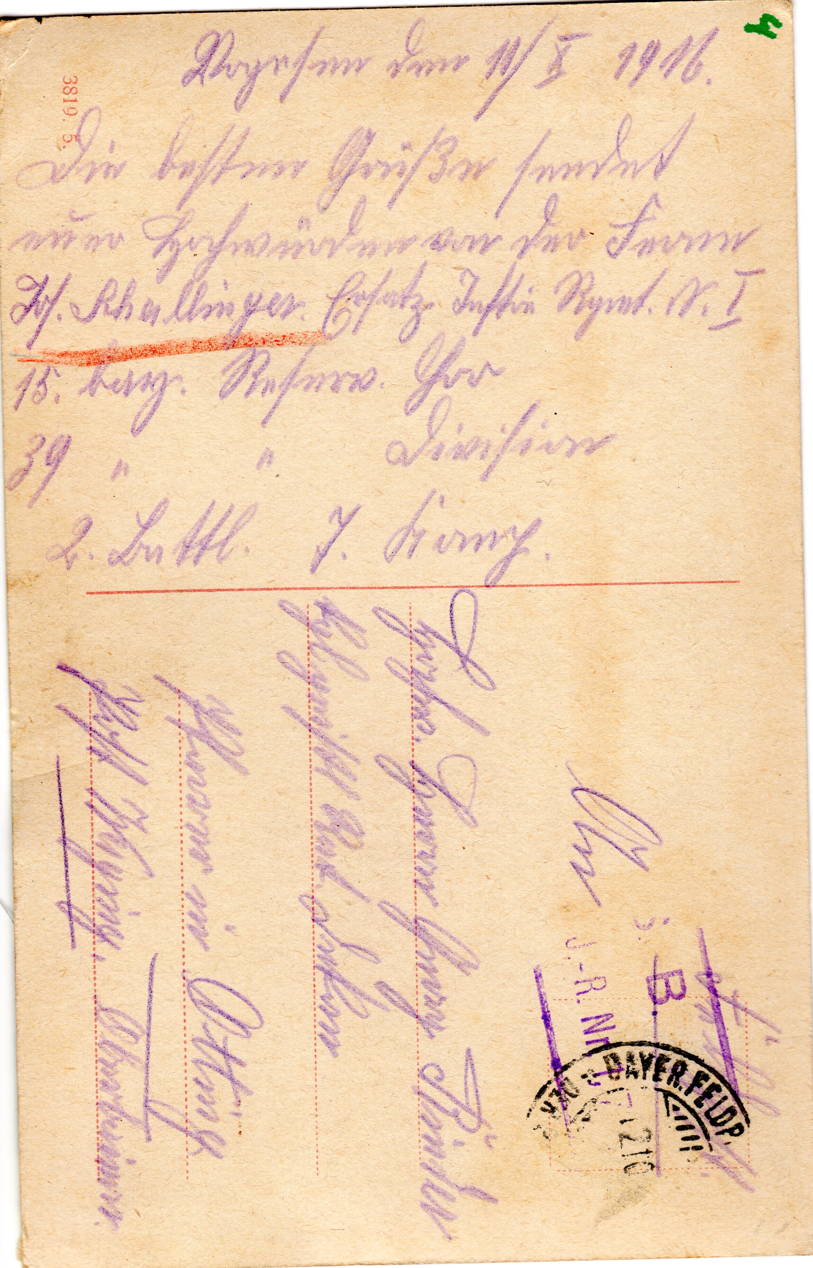 Vogesen den 11.10.1916 Die besten Grüße sendet euer Hochwürden von der Ferne Jos. Schallinger Ersatz Inftr Rgmt. N.1 15. bay Reserve Korps 39. bay Reserve Division 2. Battl. 7. Komp.