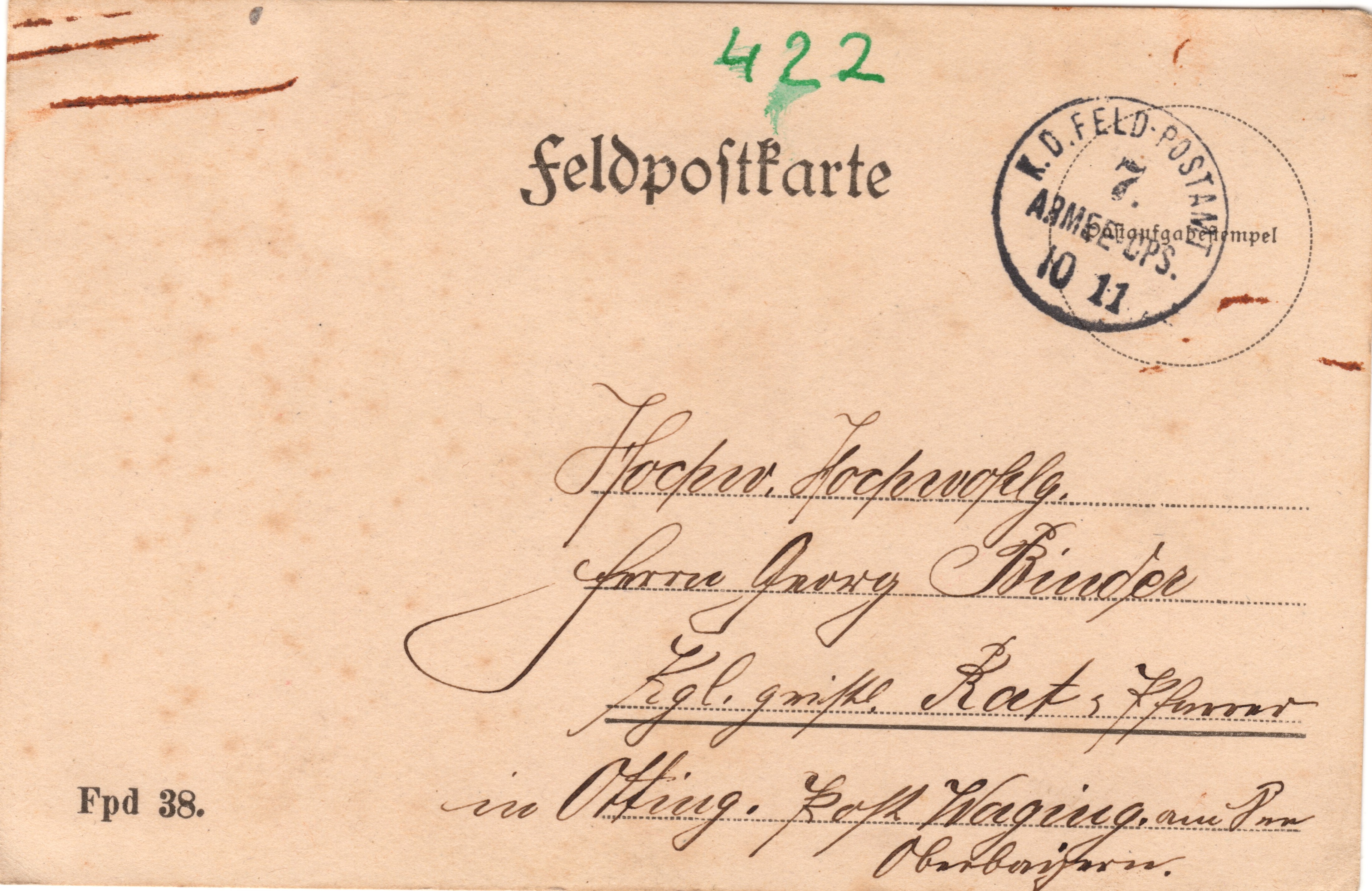 den 9. November 14 Ew Hochwohlgeboren! Gestatte mir Ihnen recht viele herzl. Grüße zu senden. Ergebenst! Barmbichler Engelb. Auf baldiges frohes Wiedersehen in der Heimat!