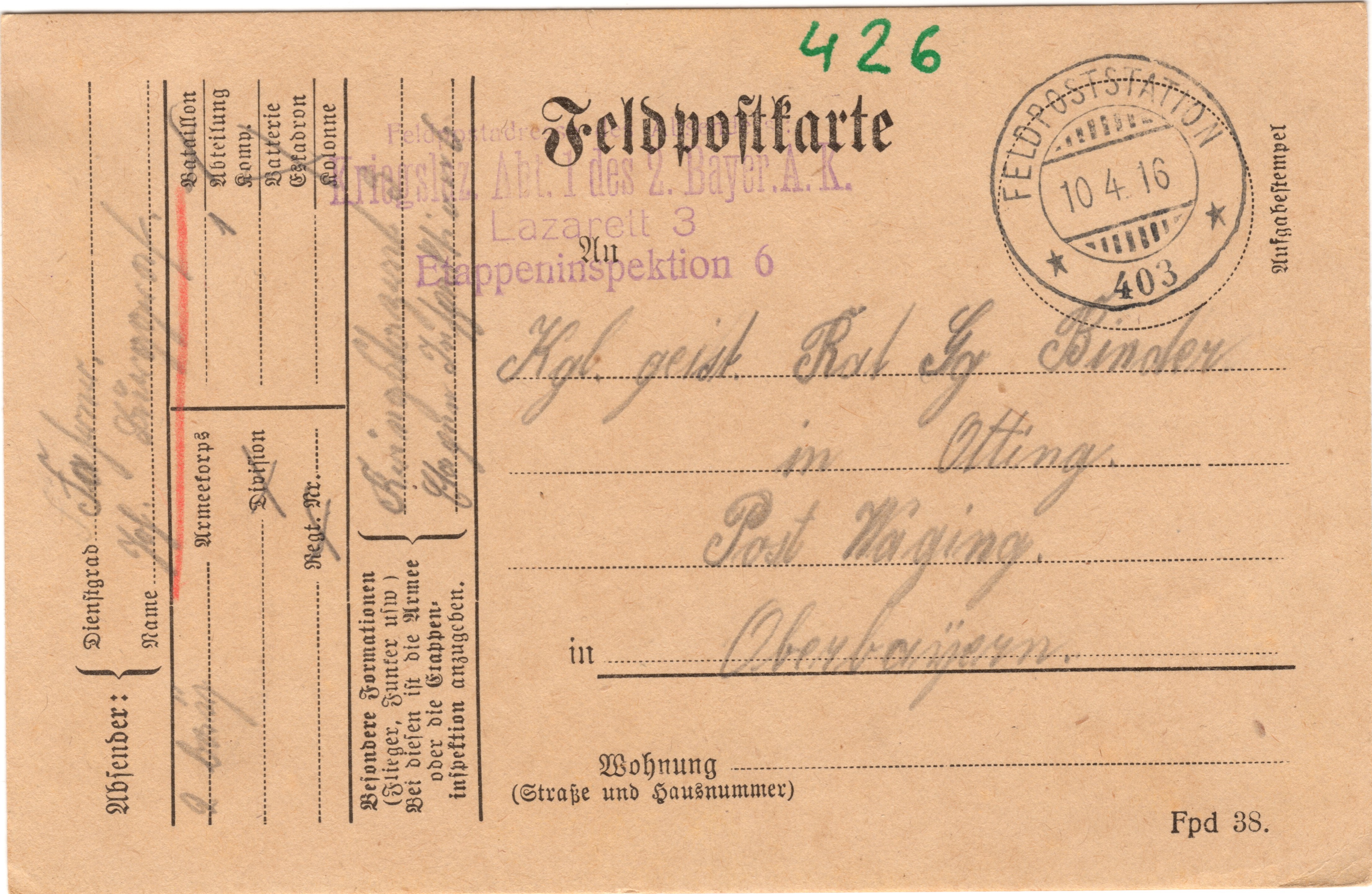Feldpostkarte senden. Ich habe heute von Ihnen ein