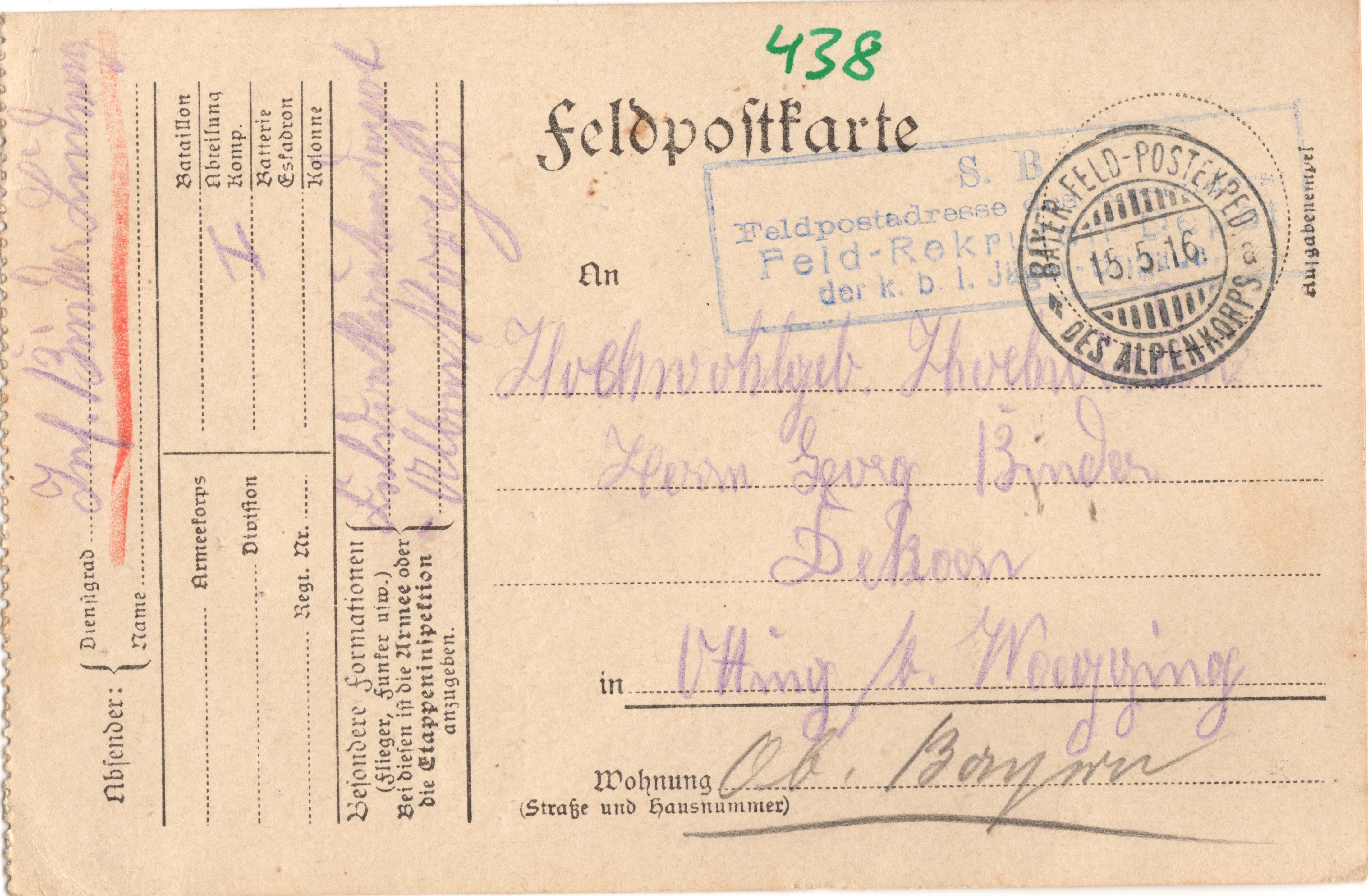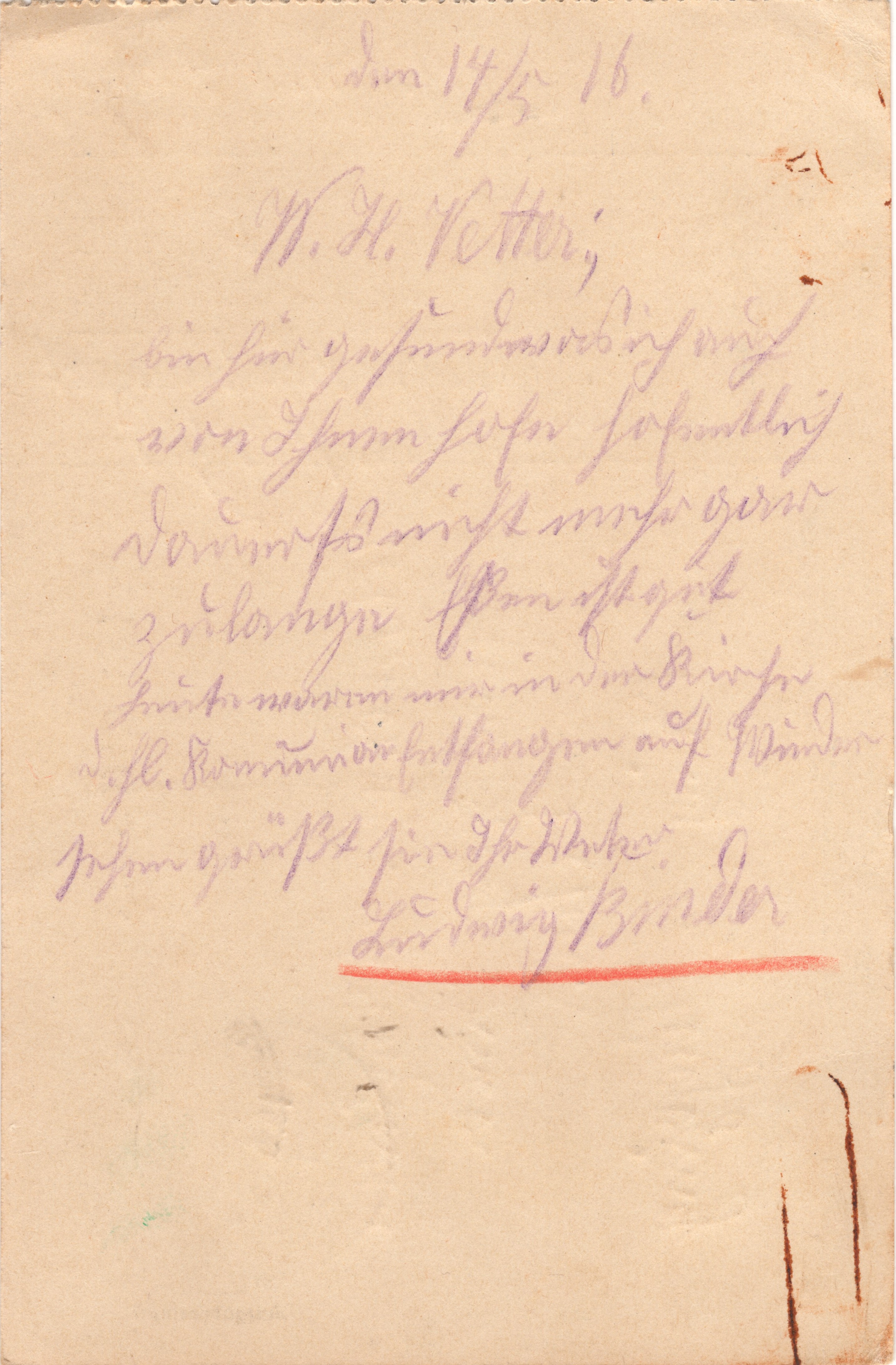 Den 14.5.16 W.H. Vetter Bin hier gesund was ich auch von Ihnen hoffe. Hoffentlich dauert's nicht mehr gar zu lange Eßen ist gut heute waren wir in der Kirche d. hl. Kommunion empfangen auf Wieder- sehen grüßt Sie Ihr Vetter Ludwig Binder