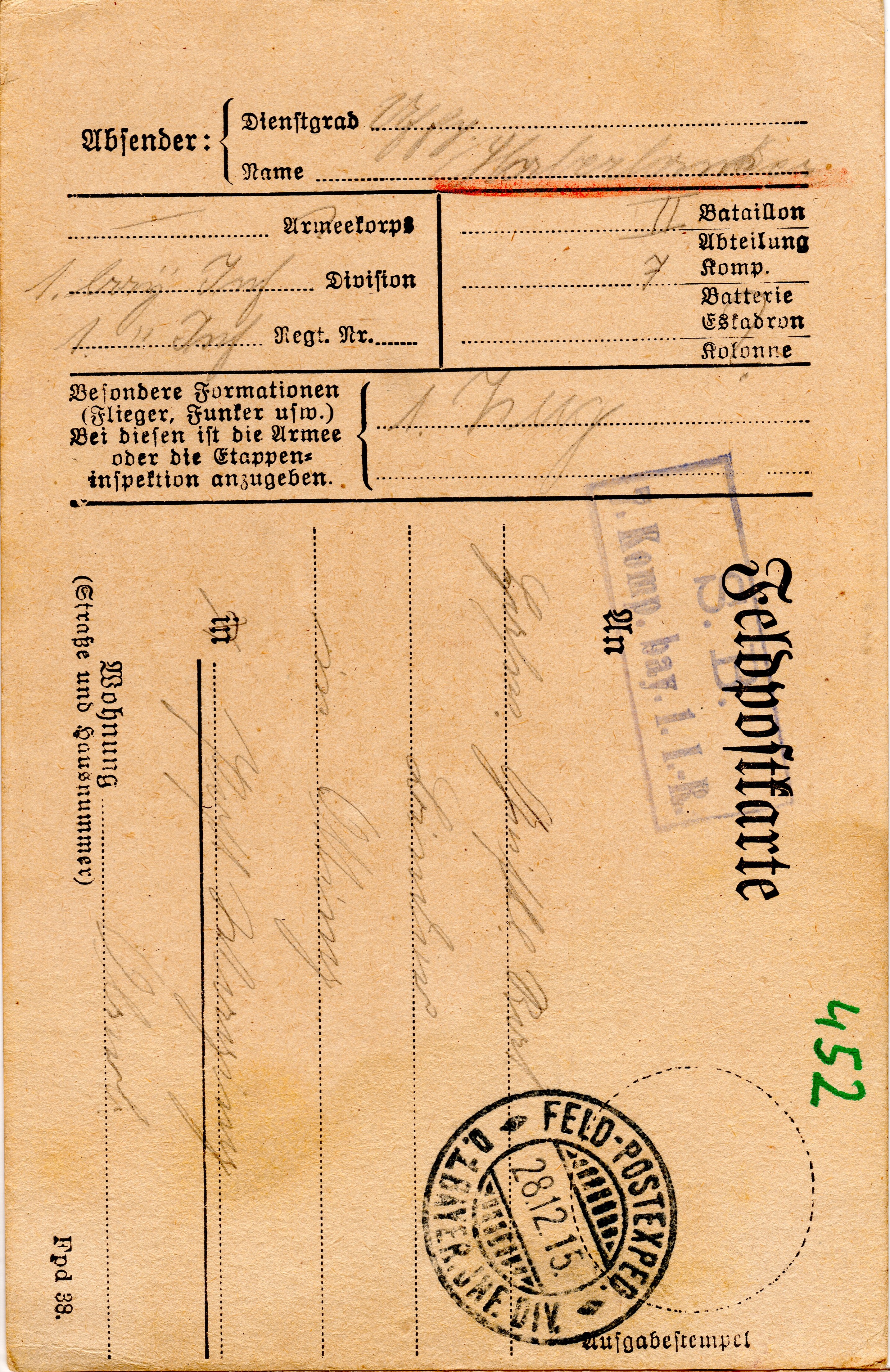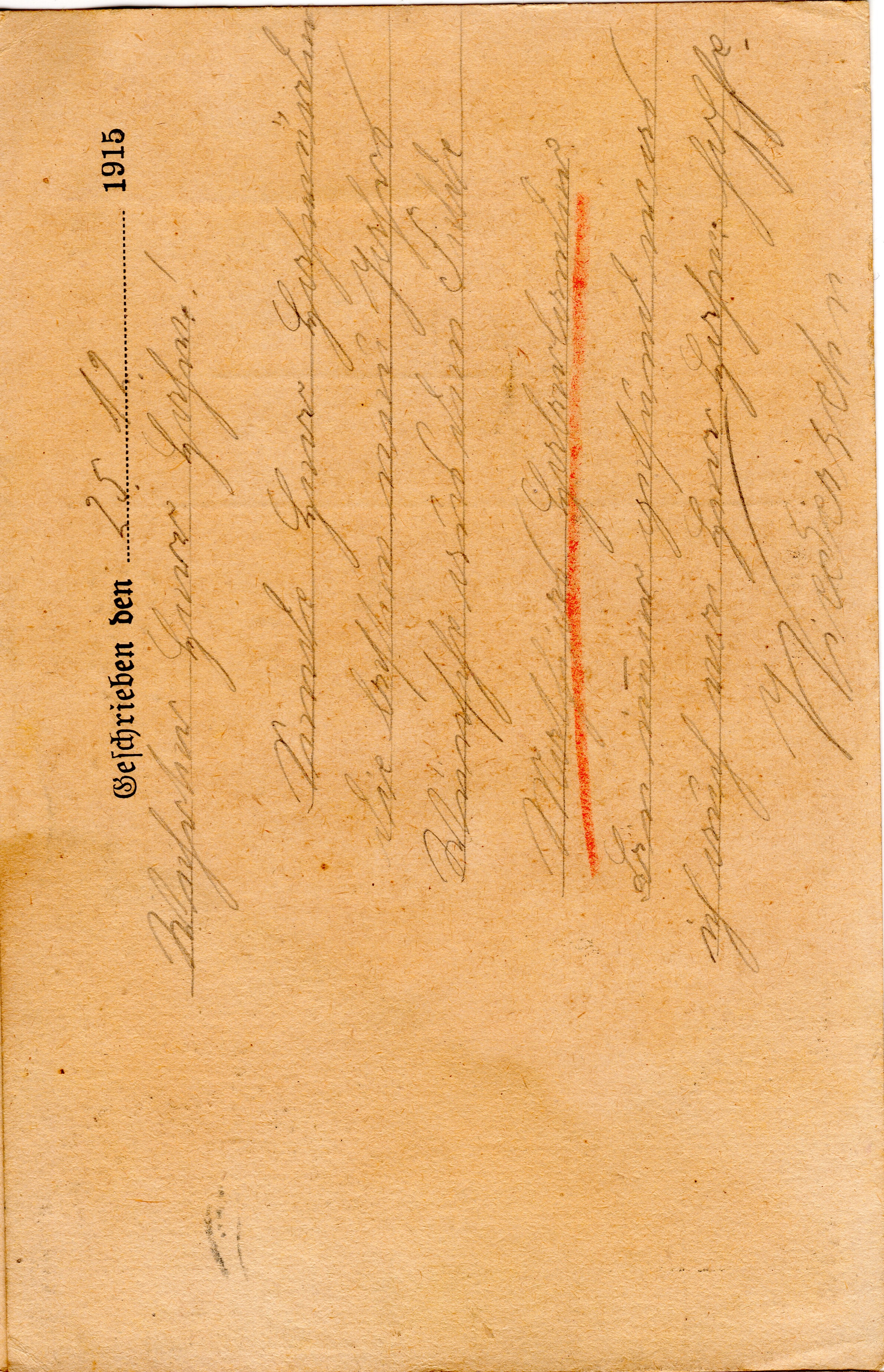 Geschrieben den 25.12.1915 Wehrter Herr Hochw. ! Sende Herr Hochwürden die besten Neujahrs Wünsche aus dem Felde Mathias Haberlander Bin immer gesund was ich auch von Euer Hochwürden hoffe. Wiedersehen
