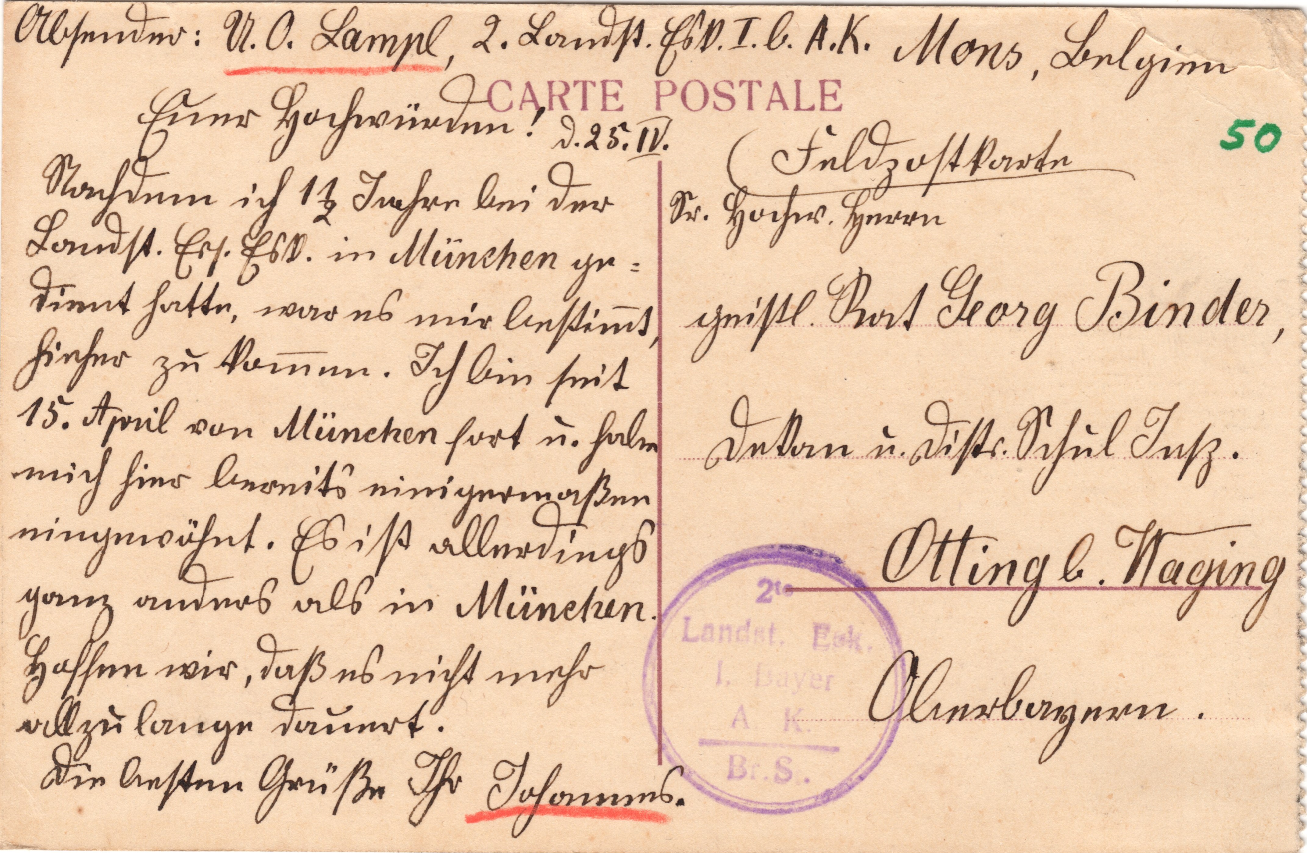 Absender: U.O. Lampl, 2. Landst. Es.V.I.b.A.K. Mons, Belgien