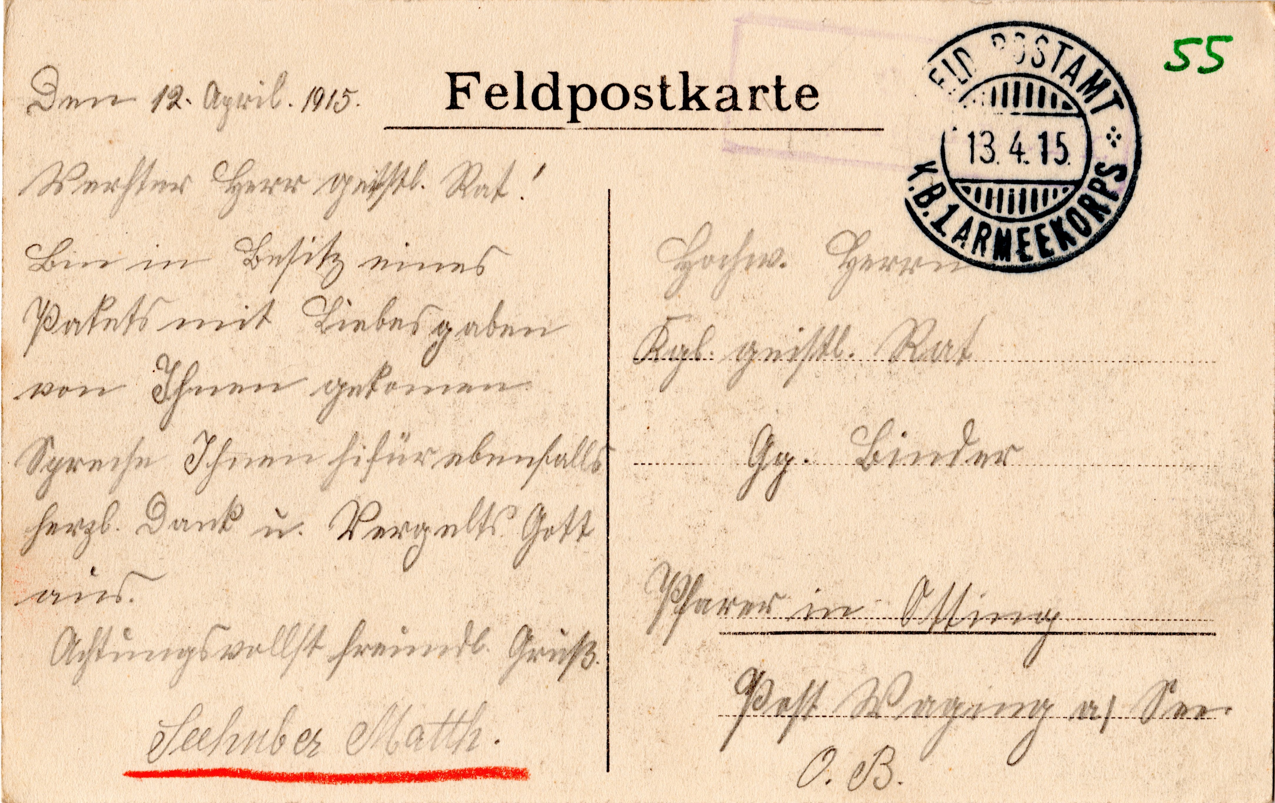 den 12. April 1915 Werther Herr geistl. Rat! Bin in Besitz eines Pakets mit Liebesgaben von Ihnen gekommen. Spreche Ihnen hierfür ebenfalls herzl. Dank u. Vergelts Gott aus. Achtungsvollst freundl. Gruß Seehuber Matth.