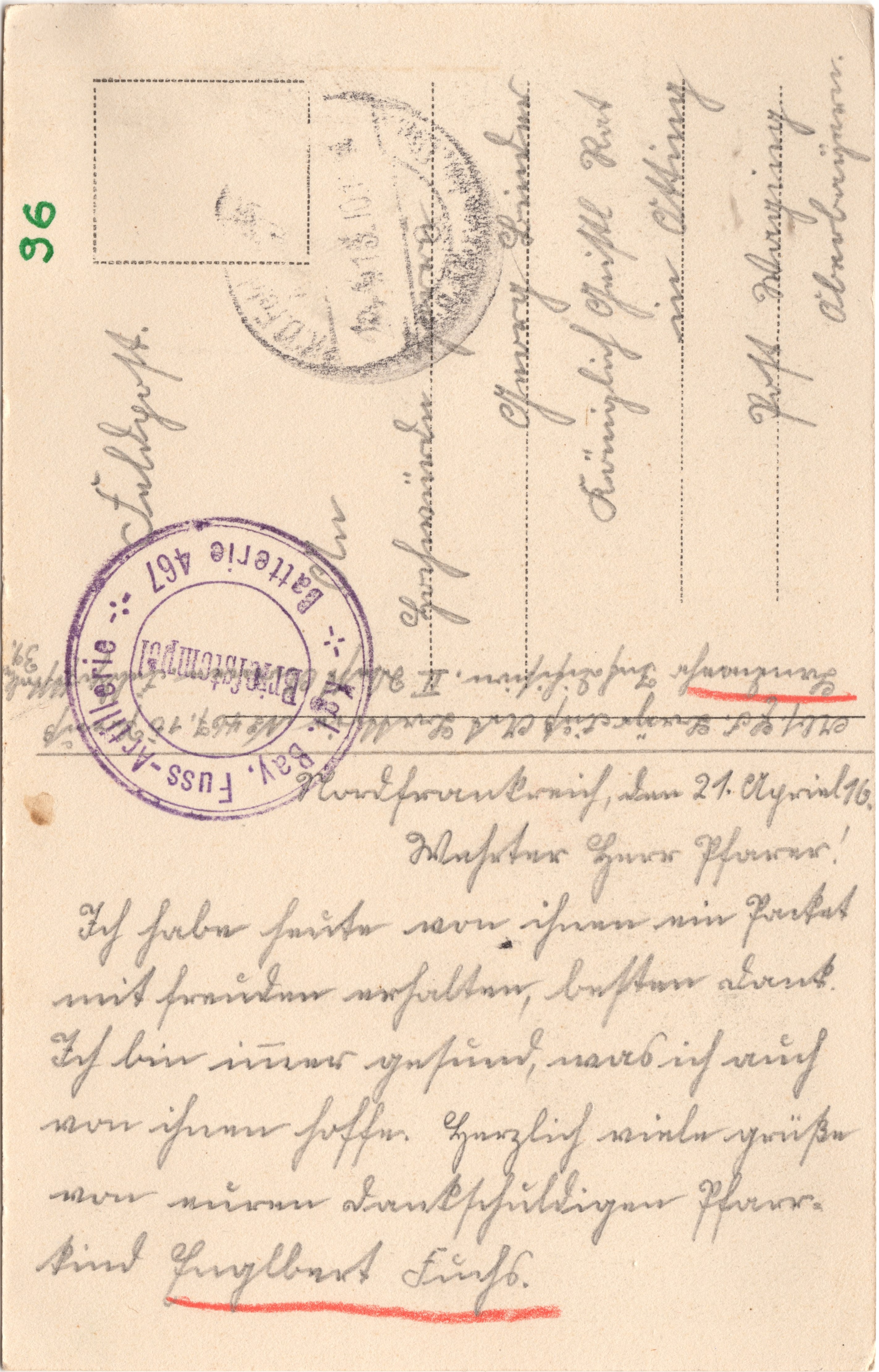 Nordfrankreich den 21. April 16 Wehrter Herr Pfarrer! Ich habe heute von Ihnen ein Paket mit Freuden erhalten, besten Dank. Ich bin immer gesund, was ich auch von Ihnen hoffe. Herzlich viele Grüße von eurem dankschuldigen Pfarr- kind Engelbert Fuchs